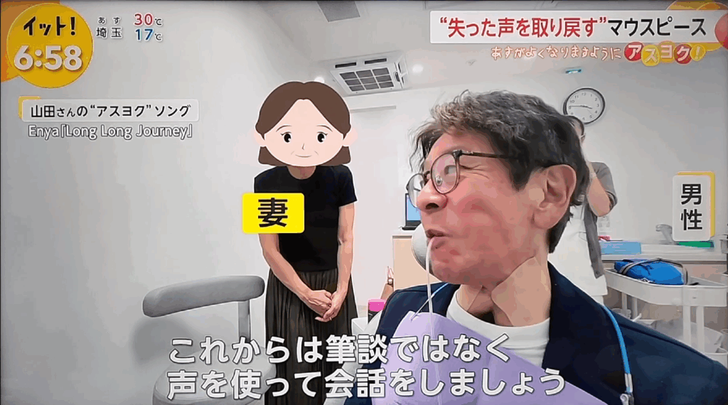 がんで喉頭全摘を受けられた方が、歯型を取り、初めてVoiceRetのマウスピースを装着し、3年ぶりに声で会話する日までを取り上げていただきました。